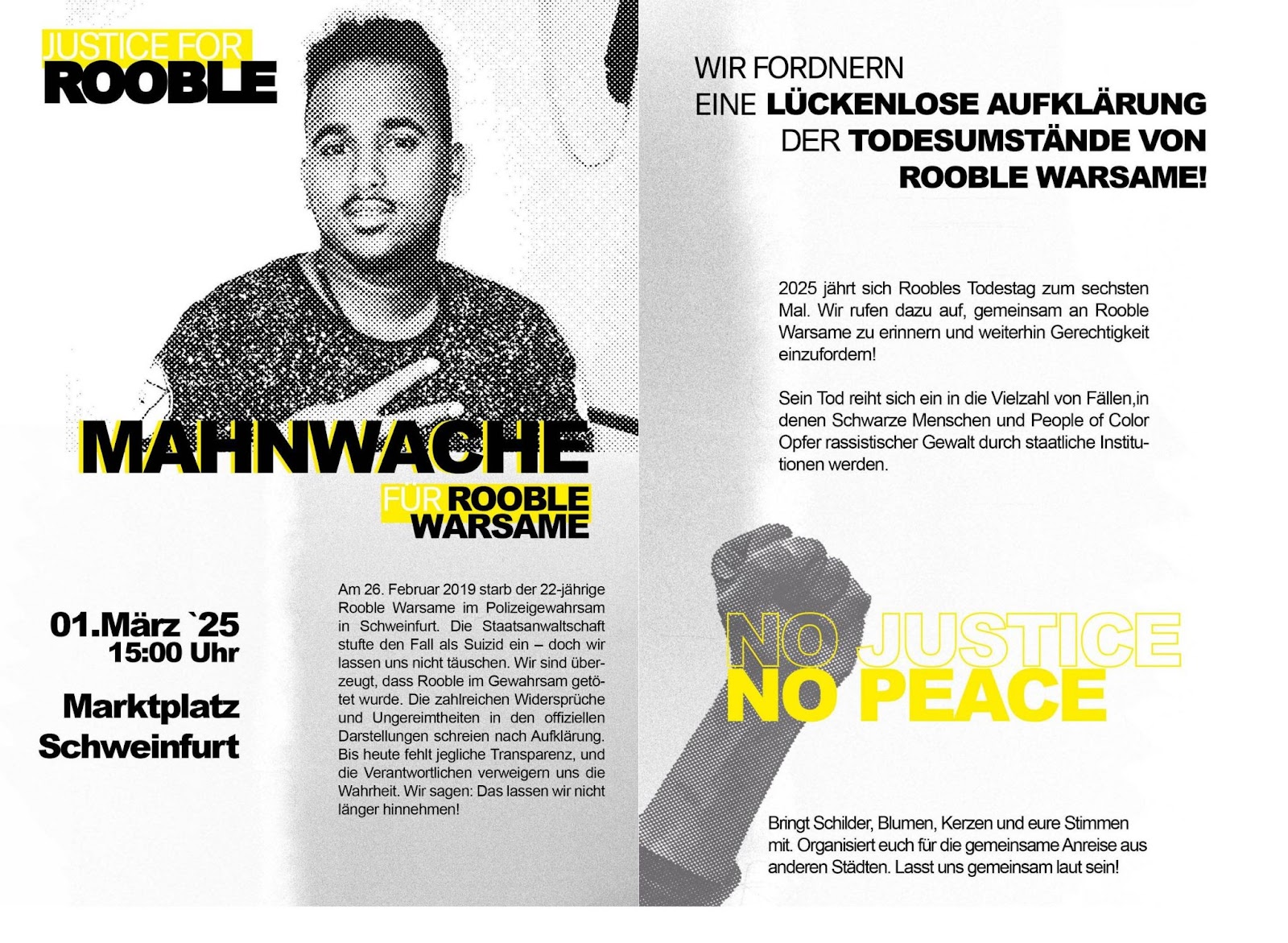 Teilt den Demoaufruf! Schickt ihn in eure Gruppen, teilt ihn auf Social Media (@Justice4Rooble), erzählt es weiter.
